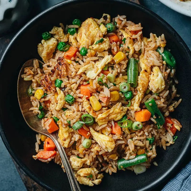 Stir-fried rice cooked with vegetables, typically seasoned with soy sauce and other spices.
